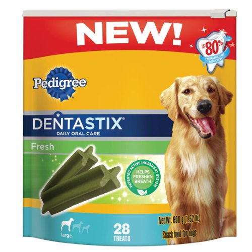 PeDiGRee Dentastix Fresh Daily Oral Care Treats are clinically proven to reduce tartar buildup, a contributor to gum disease, by up to 80% when used as part of a daily oral care routine. Plus the patented active ingredient system helps freshen breath. The unique shape and texture help clean down to the gum line. Look for the patented x-shaped treat.
